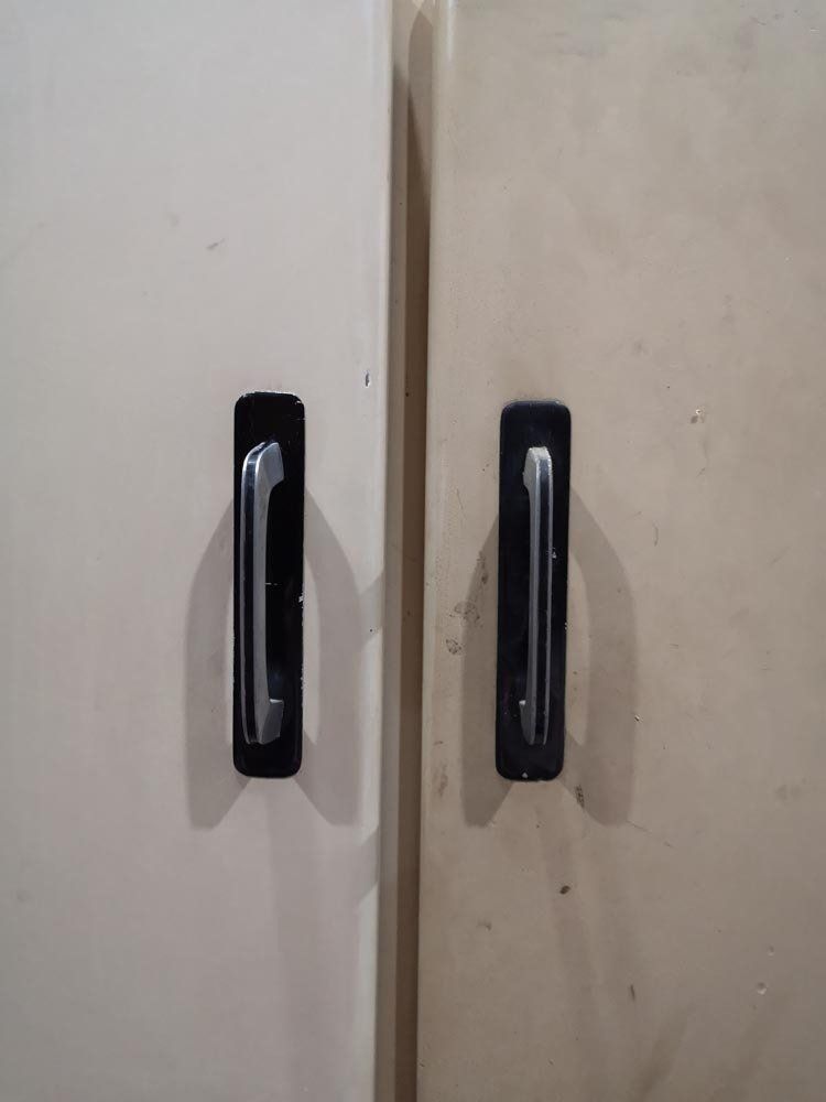 Maintenant que le support est sain et sec, j'applique ma päte à bois dans les creux et les bosses, les éclats de peinture, les trous...sur toutes les portes et le corps du Mado.