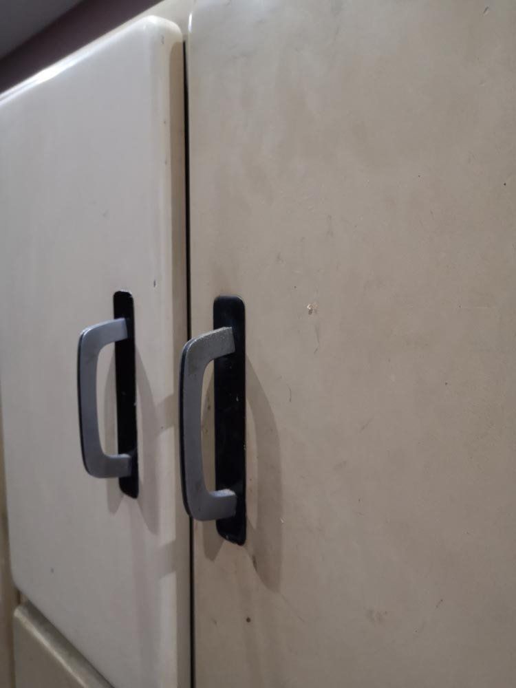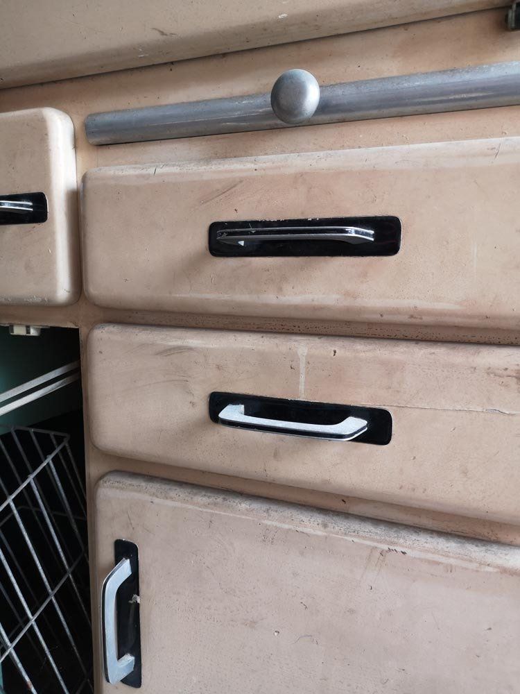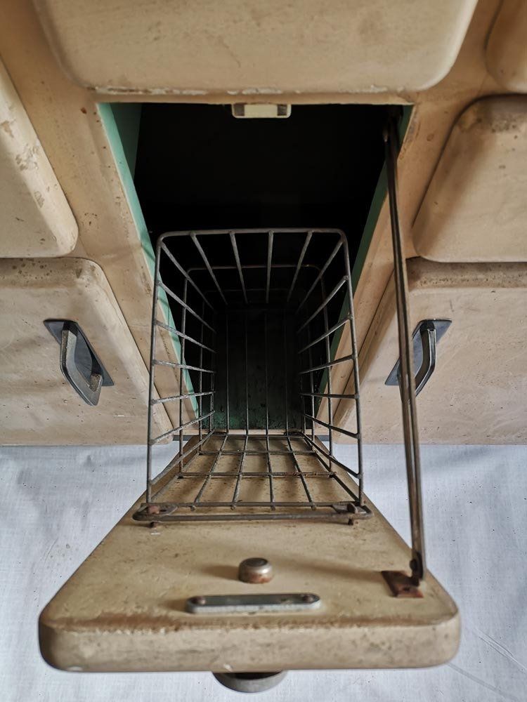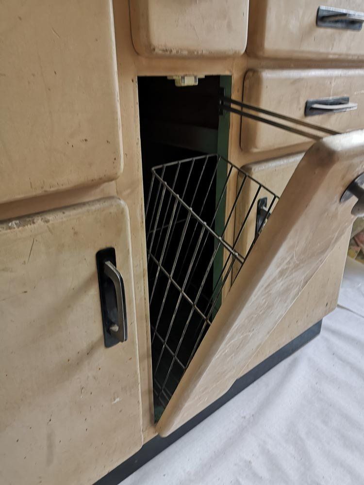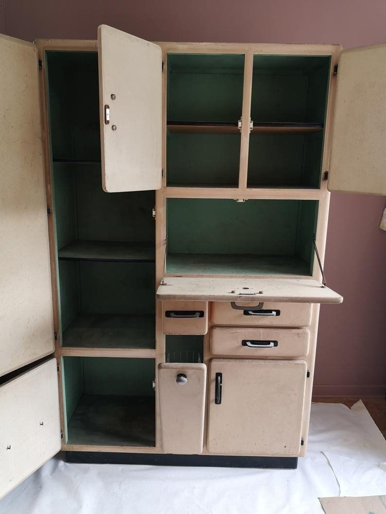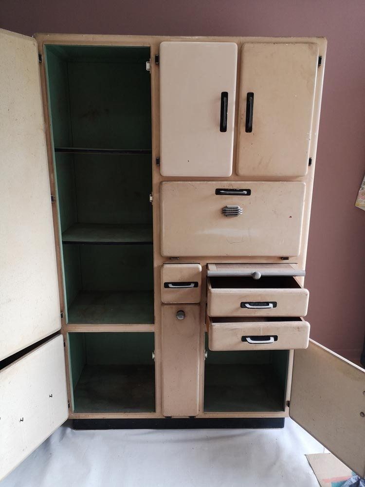 Fin des années 50 environ, des côtés arrondis dans la masse, des superbes poignées alu, garde manger, planche à pain ET cette huche à pain d'enfer !!!! Waouh...